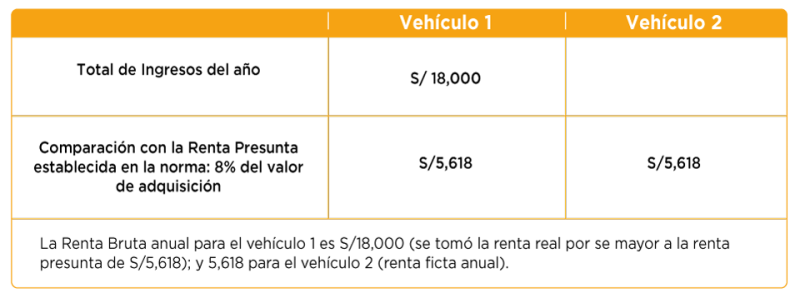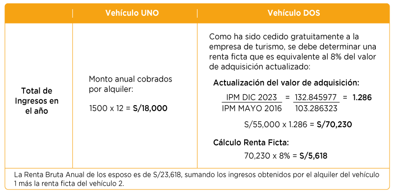 El Sr. Iván Rodríguez y su esposa compraron 2 autos en junio del 2016 al precio de S/55,000 cada uno. A finales del 2018 se compraron una camioneta, por lo que dejaron de utilizar los vehículos y antes de venderlos optaron por alquilarle uno a su vecino Alberto, por la suma de S/1500 mensuales y el otro cederle gratuitamente a la empresa de turismo de su hijo José. Tanto el alquiler como la cesión se llevaron a cabo durante el 2019.