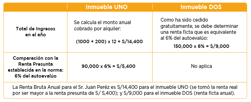 - El Inmueble UNO, es un departamento que lo tendrá alquilado todo el año 2022 a la señora Martha Sánchez. El monto del alquiler pactado es de S/ 1,000 mensuales más S/200 por concepto de agua y luz. El valor de autovalúo de este inmueble es S/ 90,000.