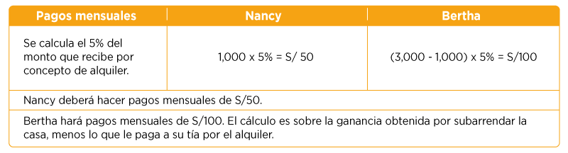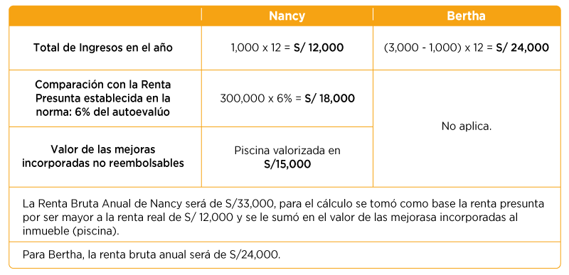 La Señora Nancy Sánchez tiene una propiedad muy grande cuyo valor de autovalúo asciende a S/300,000; como se irá a vivir con su hija a la ciudad de Piura por un año, decide alquilar su casa a su sobrina Bertha por la suma de S/1,000 mensuales.