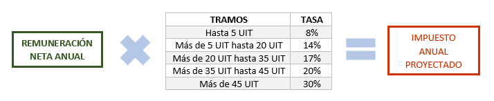| Paso 3 | Al resultado obtenido en el paso 2, se le aplica las tasas progresivas acumulativas, determinándose así el Impuesto Anual Proyectado. |