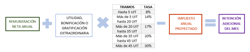 | Paso 1 | A la Remuneración Neta Anual (resultado obtenido en paso 2 de la tabla anterior) sumar la utilidad, gratificación o bonificación extraordinaria. |